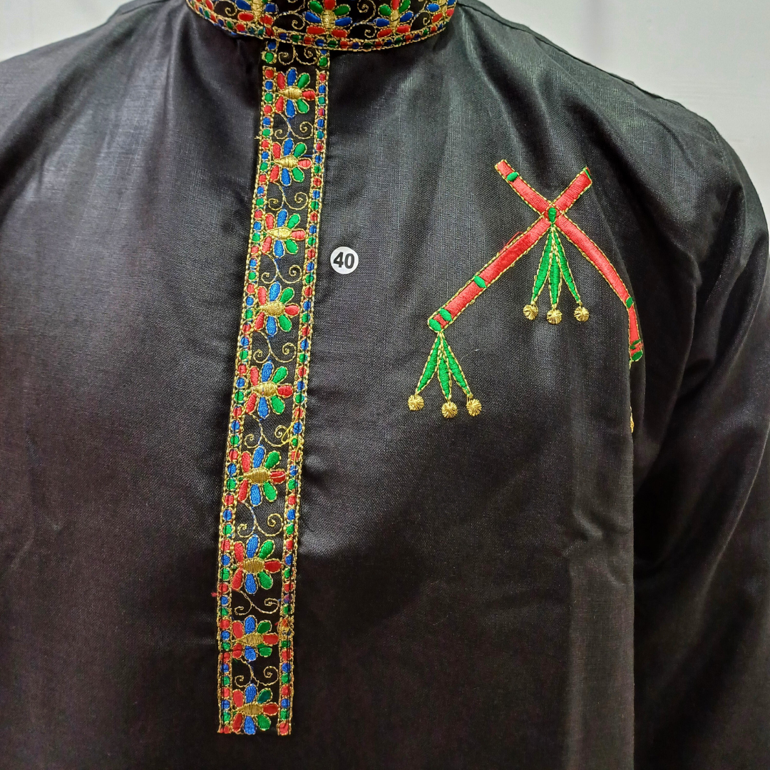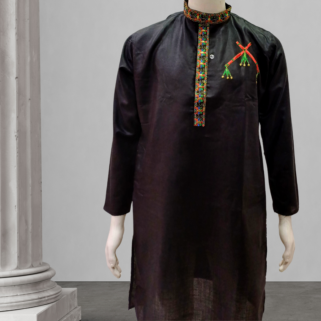 Embrace the festive spirit in this elegant black ethnic kurta, adorned with a vibrant Dandiya stick embroidery—perfect for Navratri nights or any traditional celebration. The colorful embroidered placket and collar complete the rich look.