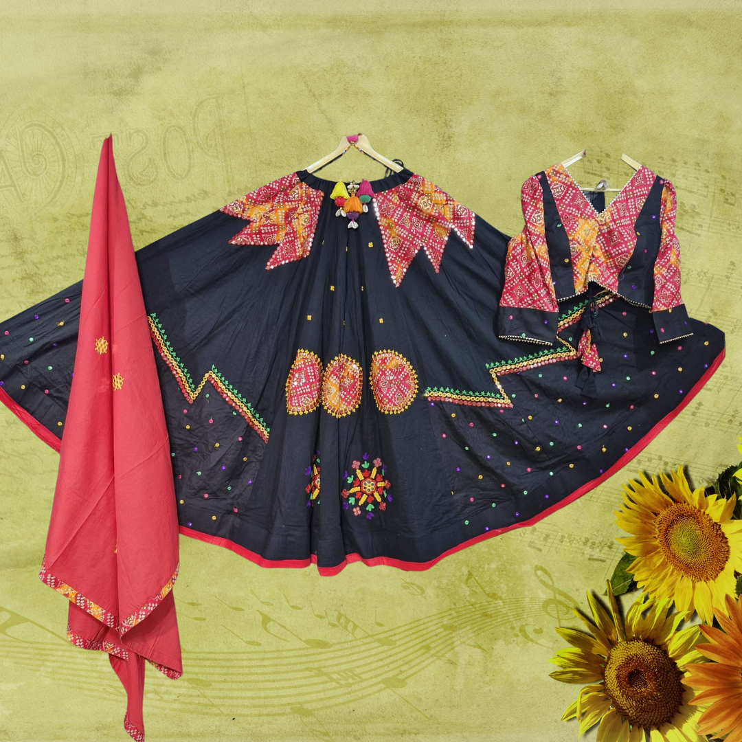 Step into the festive vibe with this stunning black chaniya choli set, beautifully adorned with traditional embroidery and mirror work β a true reflection of Gujaratβs rich culture.