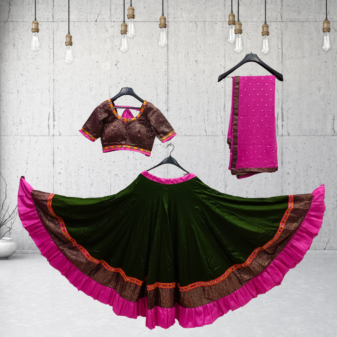 A graceful and vibrant cotton chaniya choli set, perfect for festive and traditional wear. The rich dark green chaniya features a wide 9-meter gher, beautifully bordered with intricate lace and finished with a bold pink frill. Paired with a printed maroon blouse and a bright pink dupatta with mirror work accents.