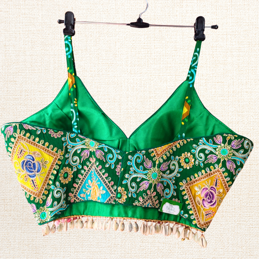 This vibrant forest green blouse features colorful floral & geometric embroidery with mirror work detailing. The strap shoulders give it a trendy fit, while the shell tassel hemline adds a playful Navratri-ready vibe.