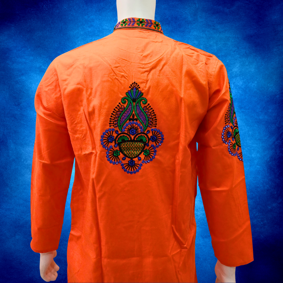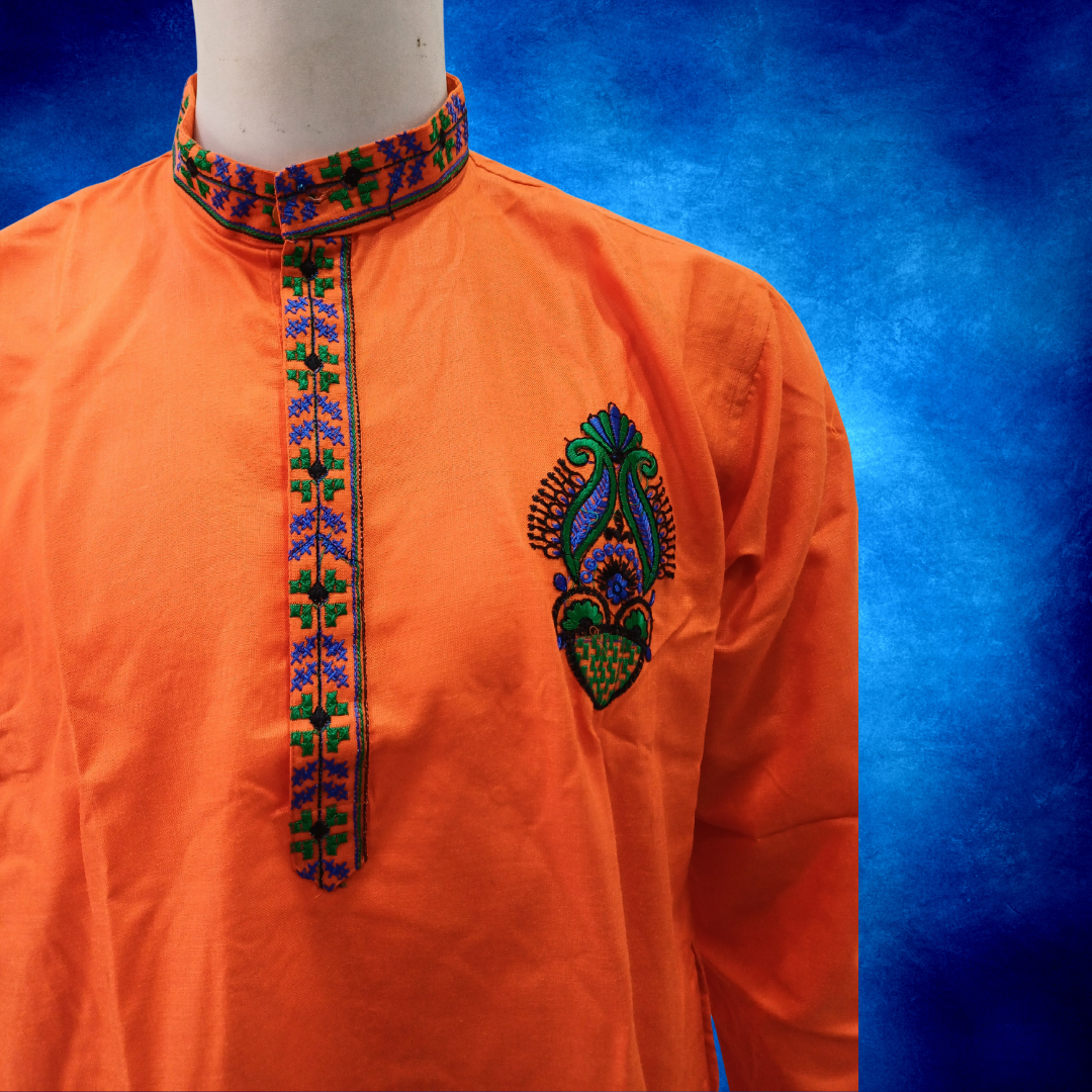 Crafted in vibrant orange cotton, this kurta features colorful, leaf-patterned embroidery along the placket and collar, with an additional embroidered motif on the sleeve, adding a unique flair.