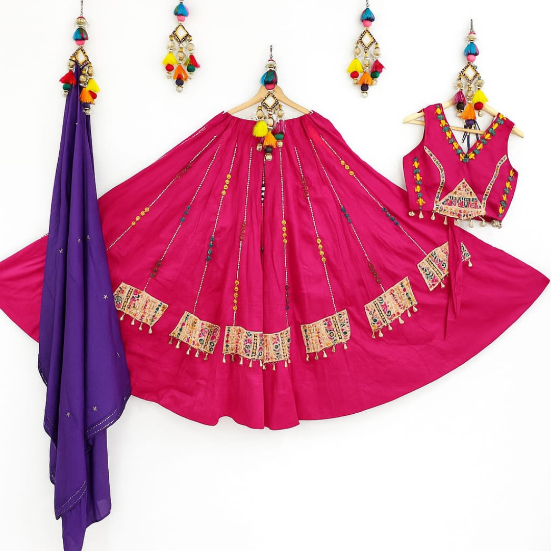 Rani Pink Chaniya Choli with Traditional Kutchi Mirror Work & Purple DupattaRani Pink Chaniya Choli with Traditional Kutchi Mirror Work & Purple Dupatta