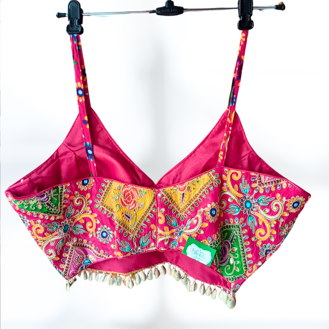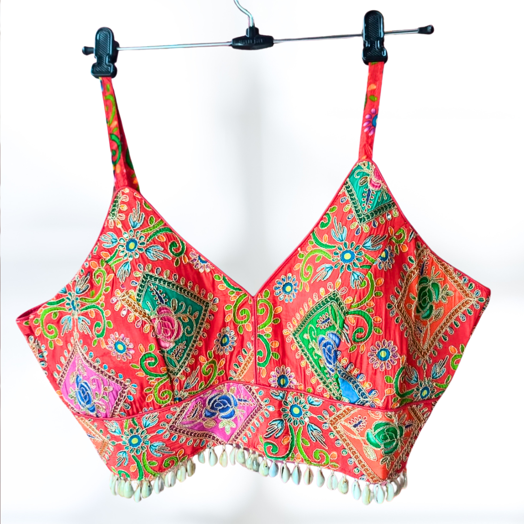 This radiant red blouse is designed with intricate multicolor embroidery in floral & geometric patterns, highlighted with mirrors. The strap shoulders give it a modern chic touch, while the shell tassel border adds a playful ethnic vibe.