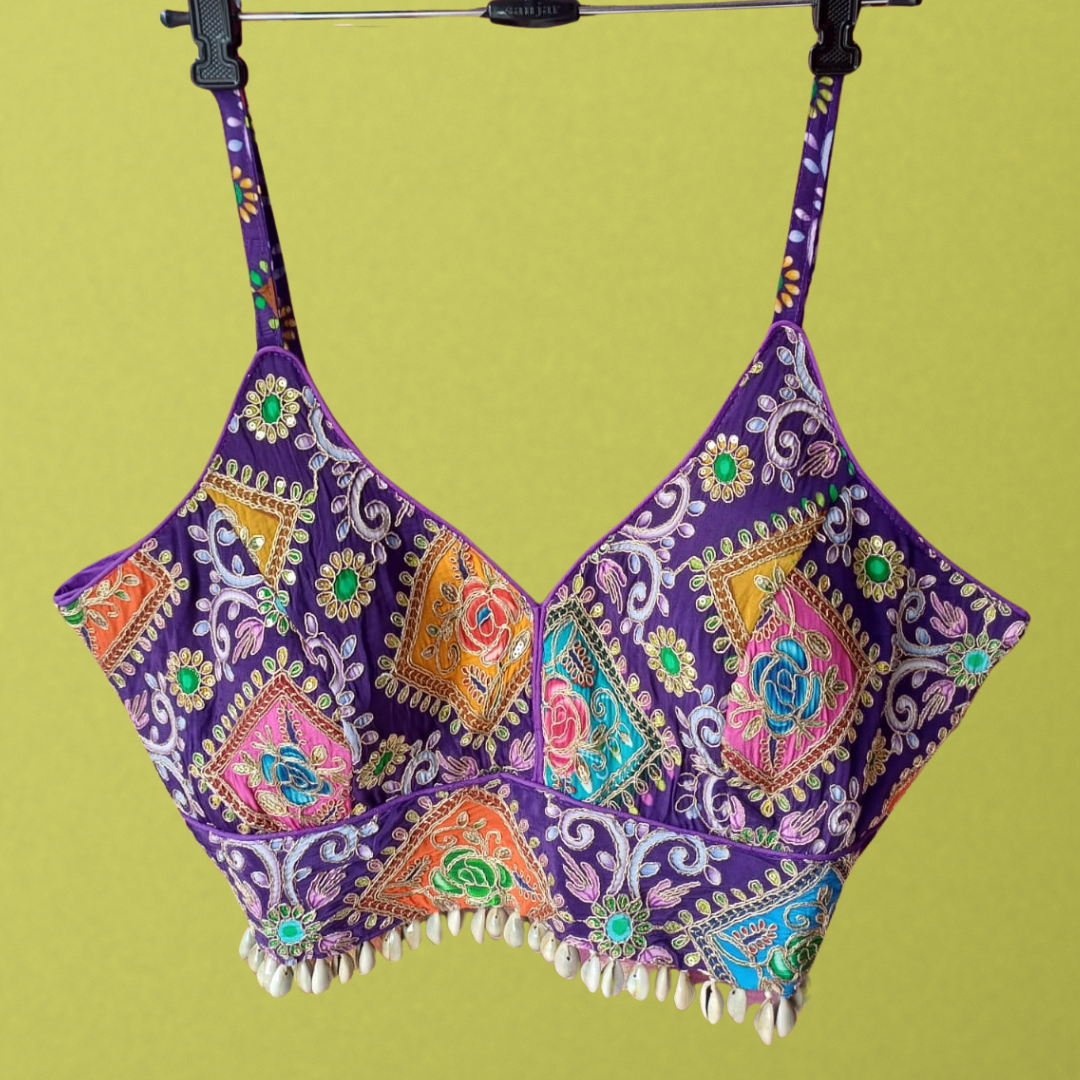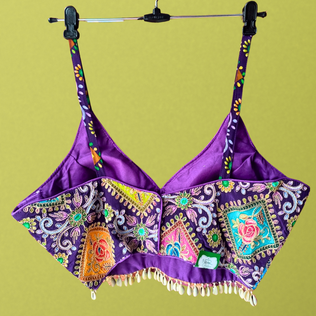 This royal purple blouse is adorned with rich multicolor embroidery featuring floral & geometric motifs, enhanced with delicate mirror work. The shell tassel border gives it a playful festive charm, while the strap shoulders keep it modern and stylish.